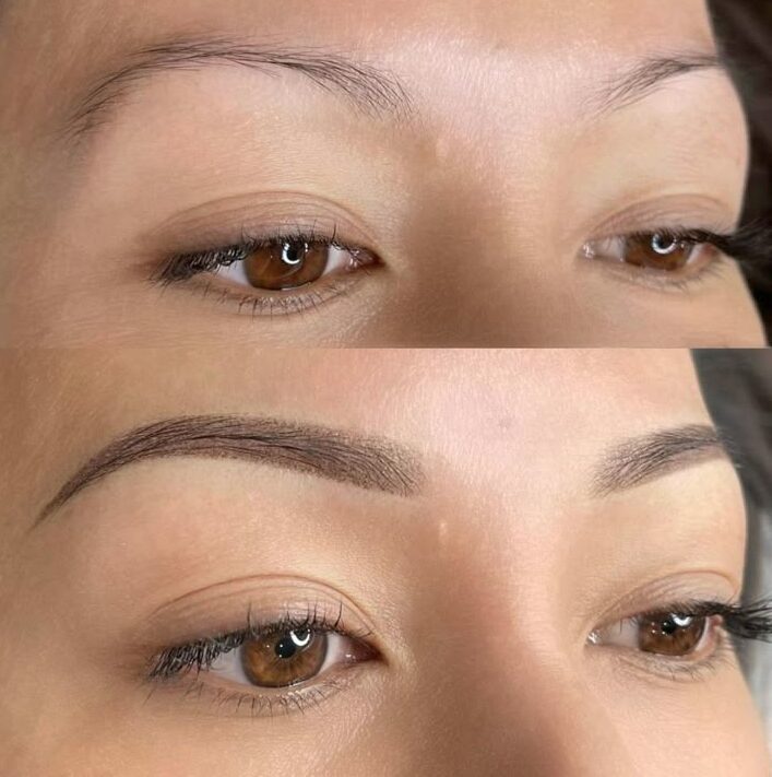 Semi permanent makeup technique that creates a soft, shaded brow pencil effect. Using a digital machine, pigment is implanted into the skin in layers, starting lighter at the front of the brow and gradually darkening toward the tail hence the “ombré” effect. This method is ideal for all skin types and provides a fuller, more defined look that lasts 2–3 years. The result is a polished, symmetrical brow with a soft, powdery finish and minimal daily maintenance.
